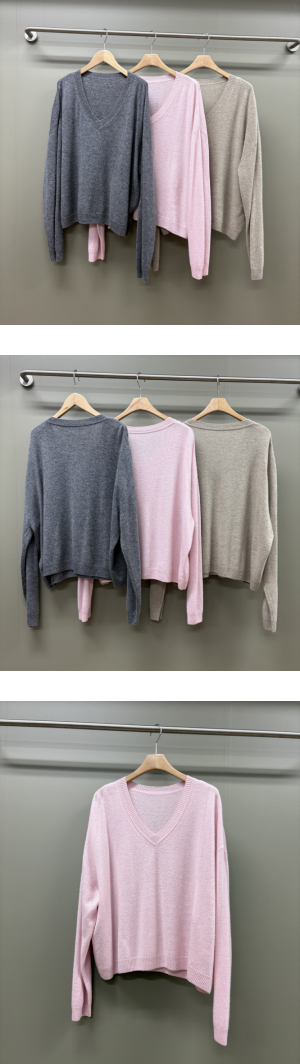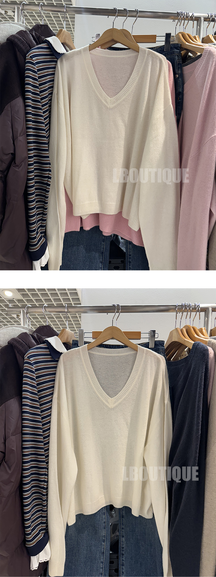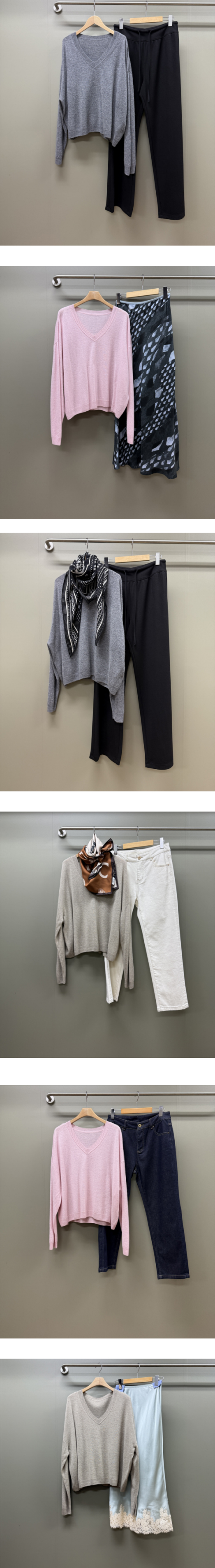 여려보이는 예쁜 브이넥라인에요. 단독으로 입을정도의 깊이에요~.